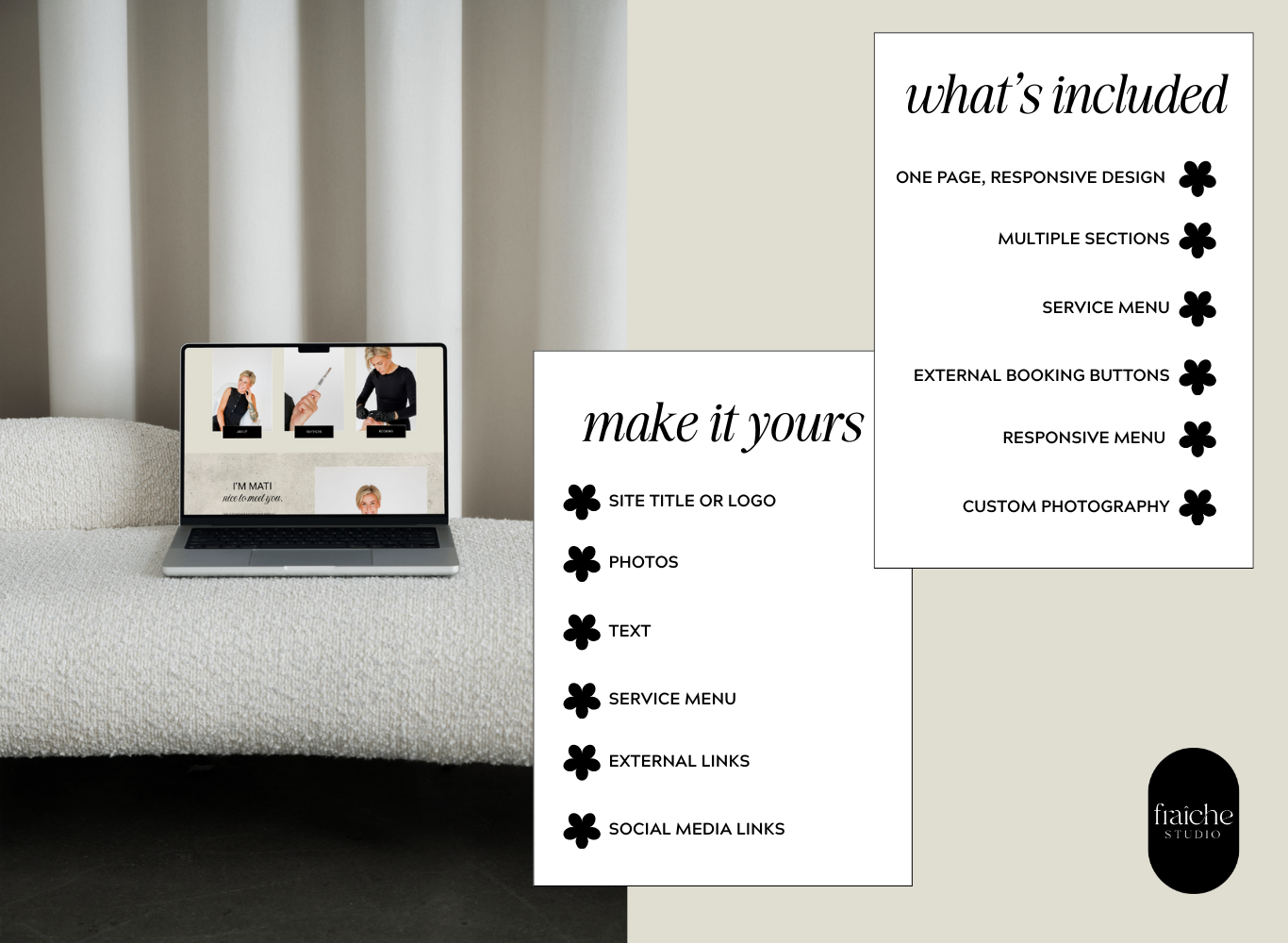 If you’d like to discuss the details before purchasing or inquire about a complete custom site, feel free to contact me at thefraichestudio@gmail.com or fill out my inquiry form here.